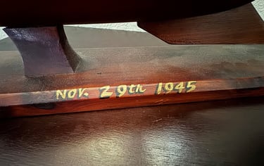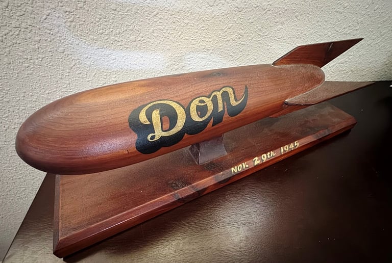 A little over a year ago, Dad asked my brothers and me what we wanted from his estate after he passed away. I said I wanted his Birthday Bomb. Let me explain what that is. During World War 2, his dad, my grandfather, worked in the Arkansas Arsenal near Pine Bluff, building bombs for the war effort. The last conventional bomb was dropped when Japan surrendered. The bomb factory was in the process of slowing down production when my dad’s 14th birthday approached in 1945. My grandfather was skilled at woodworking and had access to the wood shop where bomb prototypes were made. Since bomb production was almost at a standstill and he had not received his layoff notice, he made Dad a birthday gift, a bomb made of wood. Before joining the Air Force, my Dad went by his middle name of Don. My grandfather painted Dad’s name and his birthday on the bomb.