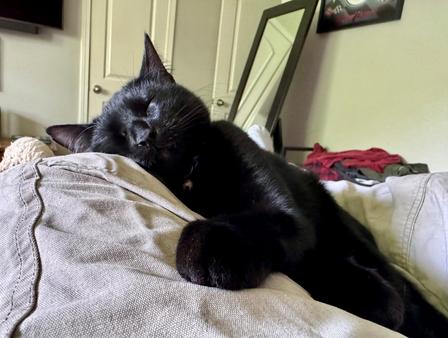 One day, Dad came home from work. He looked really tired, so he went to his bedroom to take a nap. Vlad, Luna, Moxi, and I went back there to see what he was doing. They all left when they saw he was asleep. I remembered what you told me, so I lay on his legs and fell asleep. I later woke up to Dad gently petting me. I think he was glad to have me there while he took a nap.