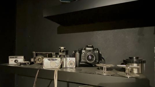 The collection of cameras on a shelf in the darkroom. My first camera is on the left