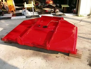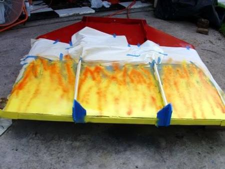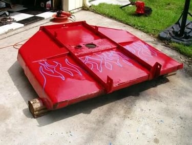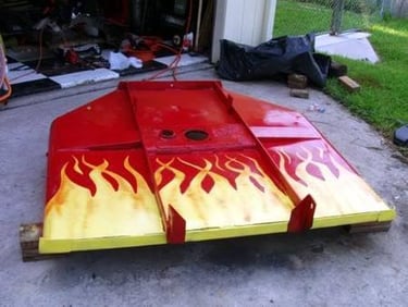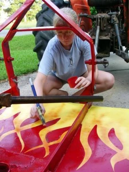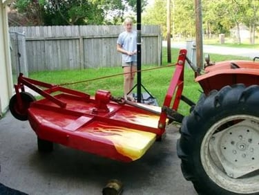 When I was unemployed, I used my Dad's tractor for mowing jobs. The bush hog needed some welding repair, so after finishing that, I painted it red like it was originally. Then I decided to paint "old school" flames, like we did on our cars back in the day. I called it Hot Rod Bush Hog after that. In one of these pictures, Allison is helping with the touch-up.